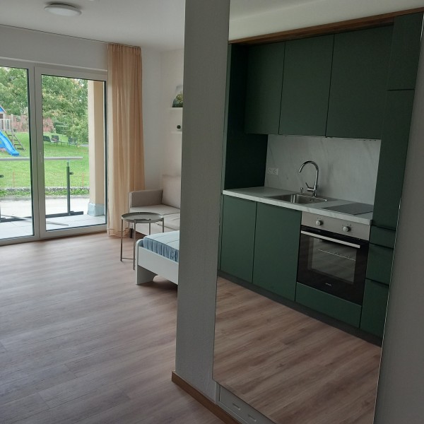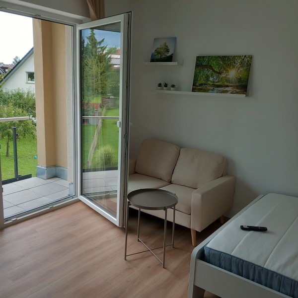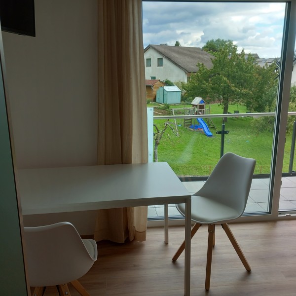 Ein großzügiger Balkon mit einer bodentiefen Fensterfront bildet den Eyecatcher jedes Apartments. Auf dem Boden findest du einen hochwertigen Eicheoptik-Vinylboden. Die Wände sind mit einem edlen weißen Streichputz versehen. Das Highlight der Apartments bildet der hochwertige Küchenblock, welcher mit Spülmaschine, Backofen, Kühlschrank mit Tiefkühler und zwei Herdplatten ausgestattet ist. Außerdem bietet das Bett mit 140 cm Breite einen hohen Komfort. Auch befinden sich immer zwei Sitzecken in jedem Apartment. Jeweils mit Tisch und zwei Stühlen und ein Loungebereich. Gegenüber befindet sich ein Fernseher. Das Badezimmer ist mit einer bodengleichen großzügigen Dusche, spülrandlosen Toilette und einem Waschbecken mit zwei Waschtischauszügen ausgestattet. Auch ein Handtuchheizkörper befindet sich im Badezimmer. Neben der Wohnungseingangstüre befindet sich ein großer Einbauschrank mit viel Stauraum.