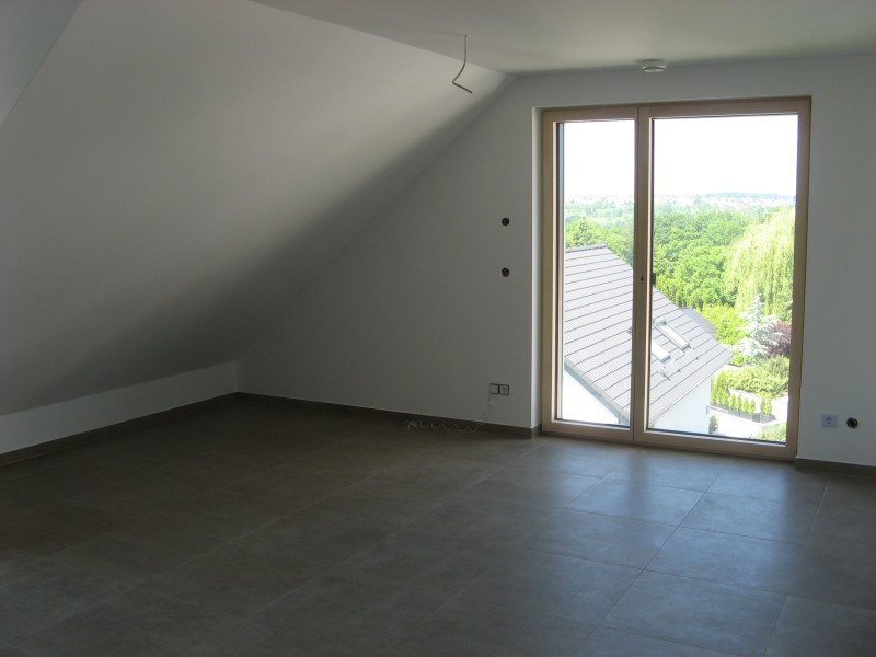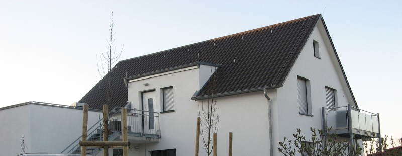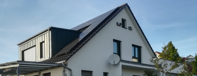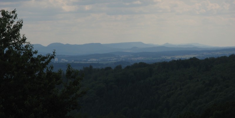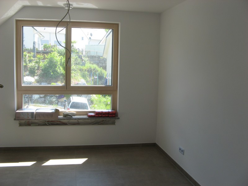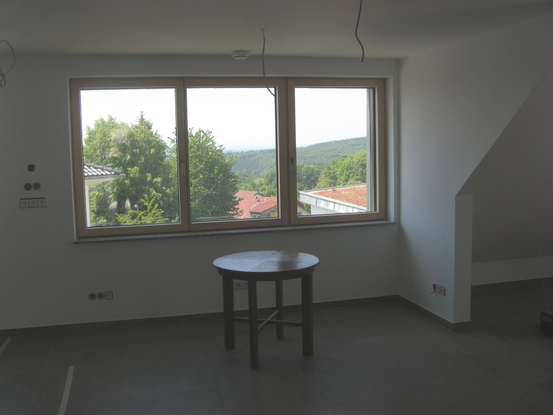 Es wurden für die Außenwände Ziegel gefüllt mit Mineralwolle und ein Wärmedämm-Verbundsystem verwendet, denn die Energie-Effizienzklasse ist A+ mit 11,6 kWh/(m²*a), Blick bis Albtrauf