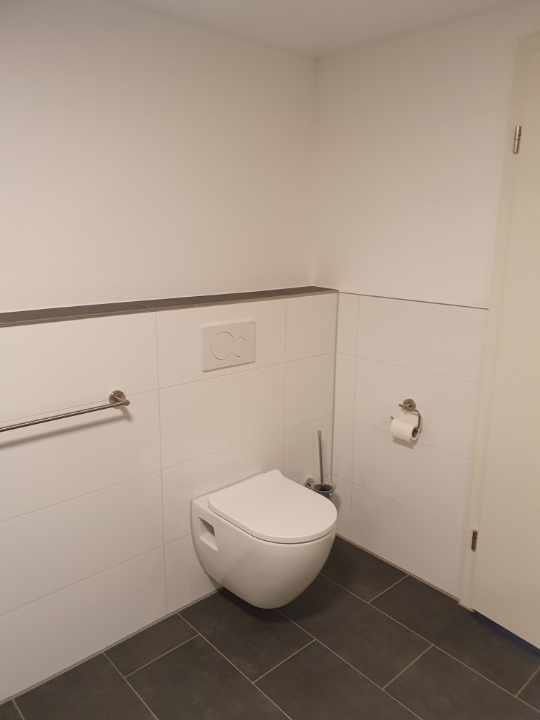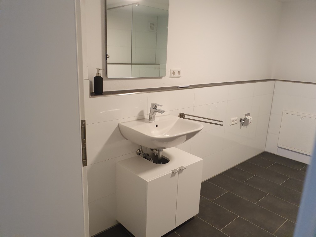 Das innenliegende Bad ist ebenfalls saniert, halbhoch gefliest und mit einer bodengleichen Dusche ausgestattet.