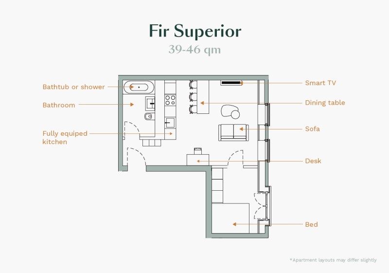 Zentral und doch tiefenentspannt. Auf 40-46 Quadratmetern erleben Sie unser Fir Superior Apartment jenseits des turbulenten Stadtlebens. Mit separatem Wohn- und Schlafbereich schaffen Sie eine klare Trennung zwischen nächtlicher Ruhe und täglichem Wohnen innerhalb Ihrer eigenen 4 Wände. In einer Zeit wo wohnen und arbeiten mehr und mehr ineinandergreifen, ist unser Fir Superior Apartment die perfekte Basis für Ihr Home Office. Unsere Fir Apartments verfügen allesamt über einen liebevoll gestalteten Wohn- und Essbereich mit offener Küche. Perfektionieren Sie Ihr Wohnerlebnis und wählen Sie Ihre neues zu Hause mit einem eigenen Balkon.