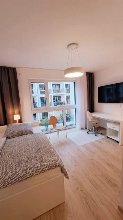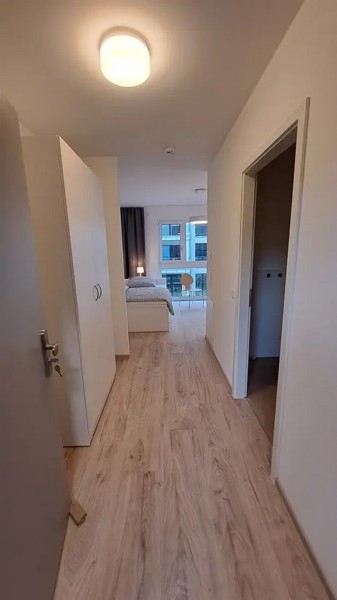 Das wundervoll helle und effizient möblierte 1-Zimmer Apartment mit komfortablen Bett befindet sich in der ersten Etage, ist bequem mit einem Aufzug zu erreichen und liegt ruhig zum grünen Innenhof. Die Küche ist mit einer Einbauküche ausgestattet.