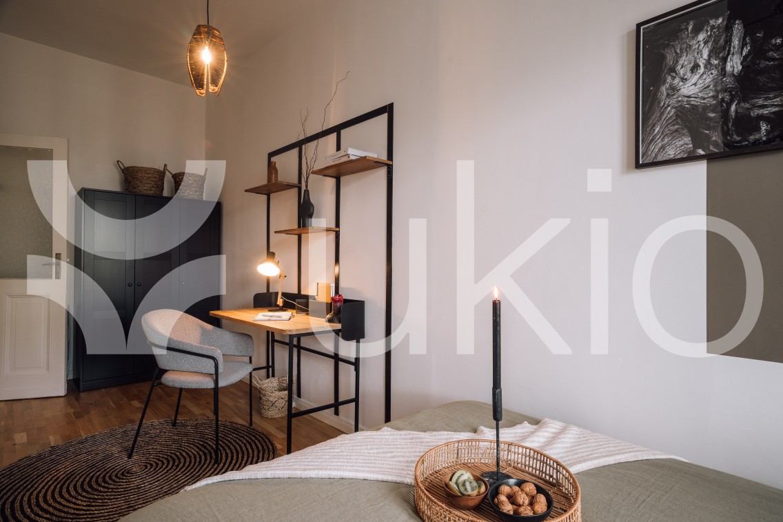 In the living room, you'll find a cozy sofa that transforms into a bed, perfect for lounging or accommodating additional guests. The living room also features beautiful hardwood floors in accordance with the apartment’s mountain theme, a dining table, and balcony access. Step out onto the balcony to enjoy a cup of coffee or a glass of wine while taking in the fresh air and the stunning views of Prenzlauer Berg. The fully furnished kitchen is equipped with everything you need to prepare your meals, from pots and pans to a refrigerator, stove, and oven.