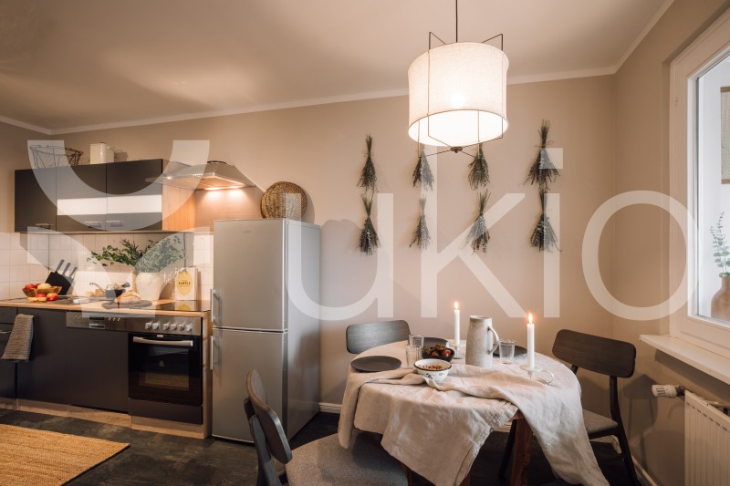 The living room has a full entertainment system and many wooden and green touches to uphold the grassland theme. The separate sunroom office space sits behind the living room and ensures that you won’t miss a beat while living in Berlin. The dining room table sits in a room adjacent to the office and leads to the modern and fully equipped kitchen. Fully furnished, this home comes with everything you need, including bedding and linens.