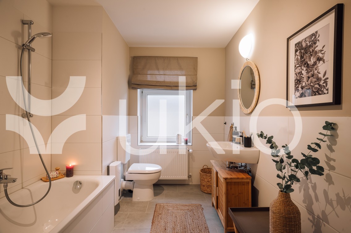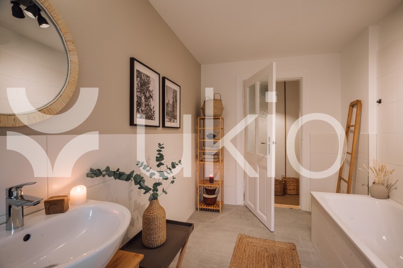 The bathroom is also spacious, classily decorated, and includes a bathtub. Fully furnished, this home comes with everything you need, including bedding and linens.