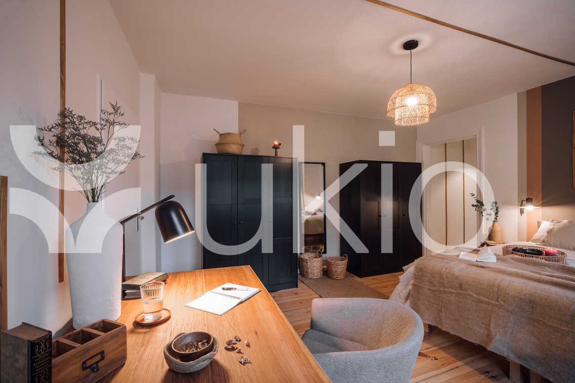 The artful design continues into the large, double bedroom, flooded with natural light. The bedroom is beautifully furnished, and comes with a dedicated workstation, so guests can feel right at home, even when at work.