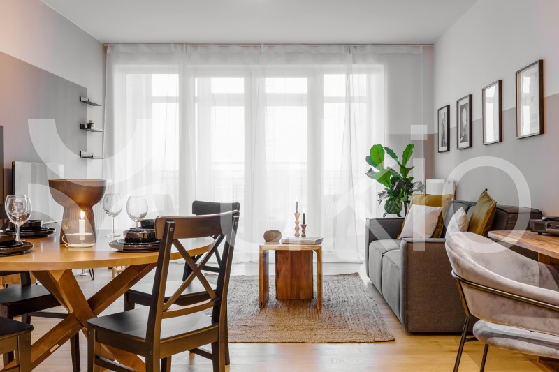 The living room benefits from light flooding in from the balcony. The balcony sitting area has double doors, so guests can enjoy the space in both the summer and winter. Espera also showcases a rustic wooden table, a full entertainment system, and a dedicated workstation in the living room.