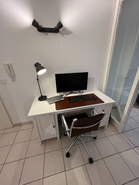 Flur: Garderobe und Schuhregal. Arbeitsecke mit Schreibtisch und High-End Computermonitor.