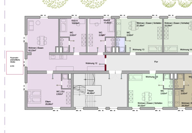 (29, 6 m² / 16, 6 m² / 17, 5 m²) mit jeweils eigenem gefliestem Bad (2, 6 m²) , in dem sich eine Duschkabine, ein Waschbecken und ein WC befindet. Alle drei Zimmer gehen von einem großen Hauptraum (52, 2 m²) ab, in dem Flur, Küche, Essen- und Wohnbereich zugleich seinen Platz finden.