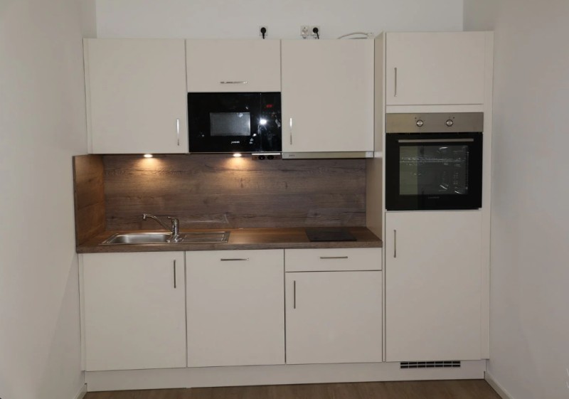 Die Küche beinhaltet einen Backofen, eine Geschirrspülmaschine, Dunstabzugshaube, Herd mit Ceranfeld, etc.