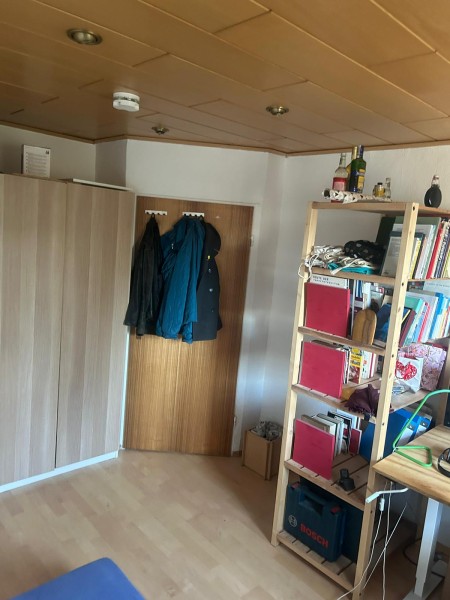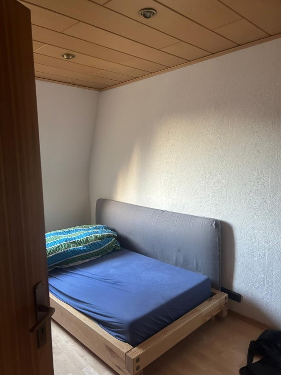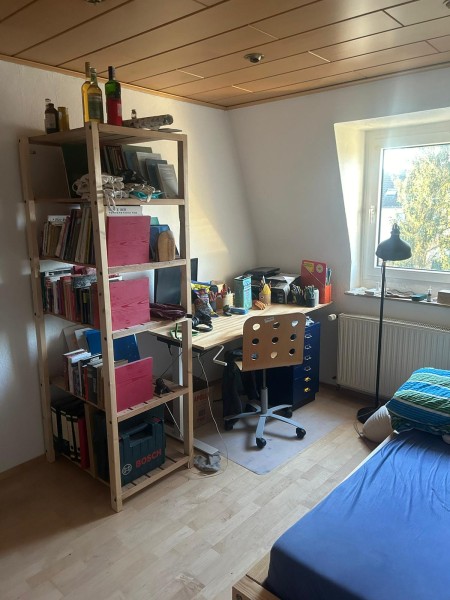 Mein Zimmer ist kompakt hat aber trotzdem alles was du brauchst. Neben einem großen Kleiderschrank für all deine Sachen befindet sich hier auch das von mir gebaute Bett sowie ein großer, höhenverstellbarer Schreibtisch. Das Zimmer ist nach Westen ausgerichtet und bietet zum Arbeiten gerade optimale Lichtverhältnisse. Das Zimmer ist auf den Innenhof ausgerichtet, daher hört man von der Straße fast nichts. Die an- und abfahrenden U-Bahnen hört man aber auch von hier. Aber keine Angst, ich schlafe bei offenen Fenster und es ist echt nicht laut.