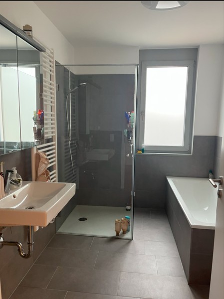 Das großzügige Badezimmer punktet mit einer Kombination aus Dusche und Badewanne sowie einem Tageslichtfenster, das für eine angenehme Atmosphäre sorgt.