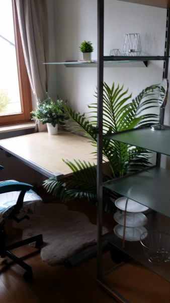 Es ist mit einem Holzhochbett (1,20 x 2,00 m), einem Kleiderschrank, 2 gr. Glas/Holzregalen, sowie 1 Chefsessel und Schreibtisch ausgestattet. Unter dem Hochbett befindet sich ein Tagesbett.
