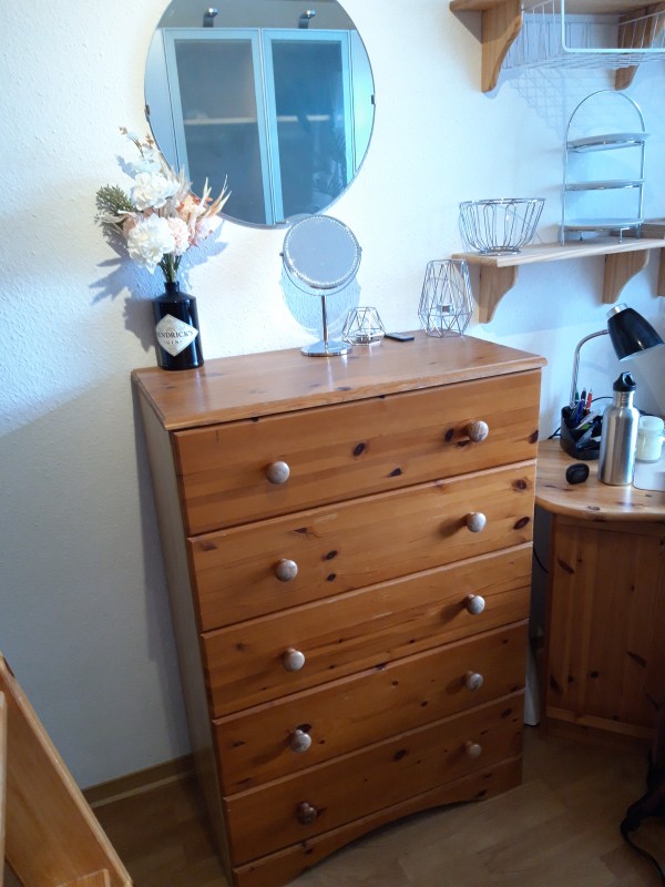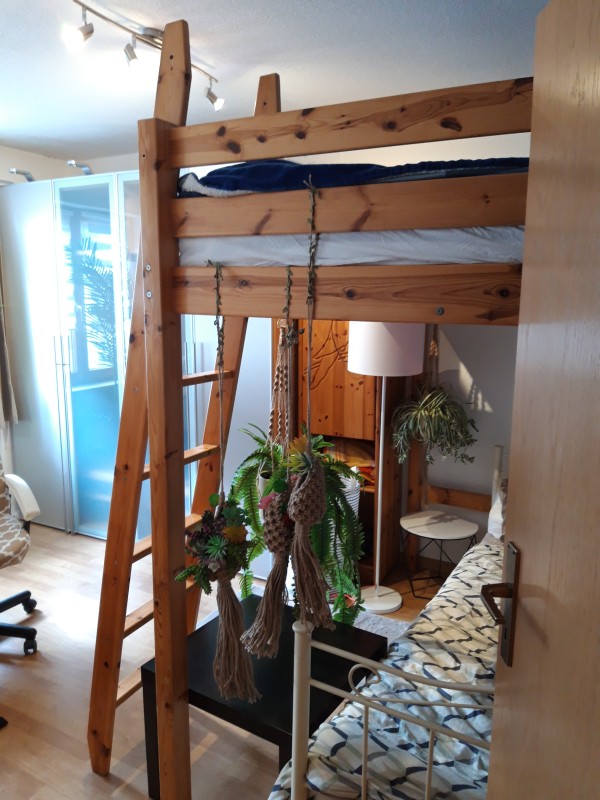 Es ist mit einem Holzhochbett (1,40 x 2,00 m), einem großen Kleiderschrank, 1 weiterem Holz-Hochschrank, 1 Kommode u. diversen Wandregalen, sowie 1 Chefsessel und Holz-Schreibtisch ausgestattet. Unter dem Hochbett befindet sich ein Tagesbett.