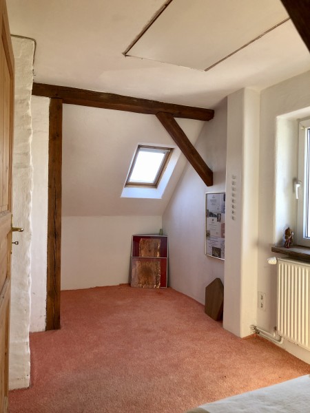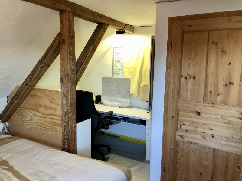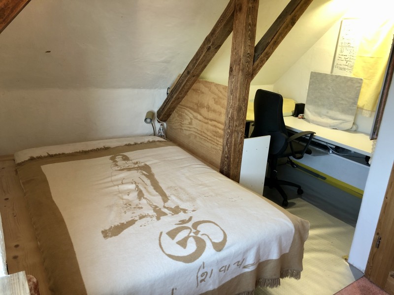 Ein kleines möbliertes Zimmer ( ca. 14 qm) mit Bett ( 140cm breit), Schreibtisch und zwei Fenstern. Es ist hell und hat offene schöne Holzbalken. Mitbenutzung des ganzen Hauses mit modernem Wohn - Eß und Küchenbereich mit riesiger Terrasse und großem Garten. Das Zimmer befindet sich in einem sanierten alten lichtdurchfluteten Haus mit Klavier und Kamin fußläufig an der Döberitzer Heide.