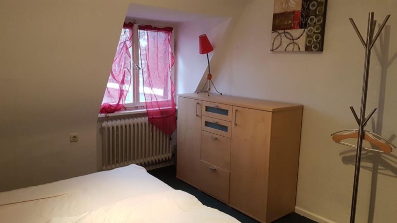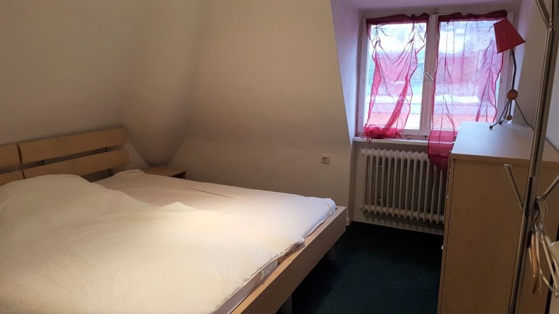 In den WG-Zimmern stehen ein großes Bett (2x2m) alternativ ein schmales Bett (1x2m), Nachttische, Kommode, Kleiderschrank, Kleiderständer und Stuhl.