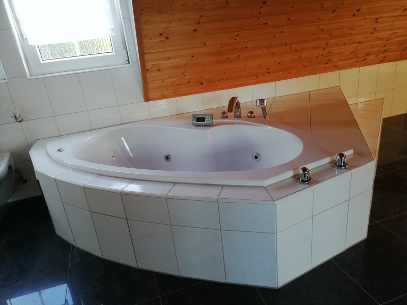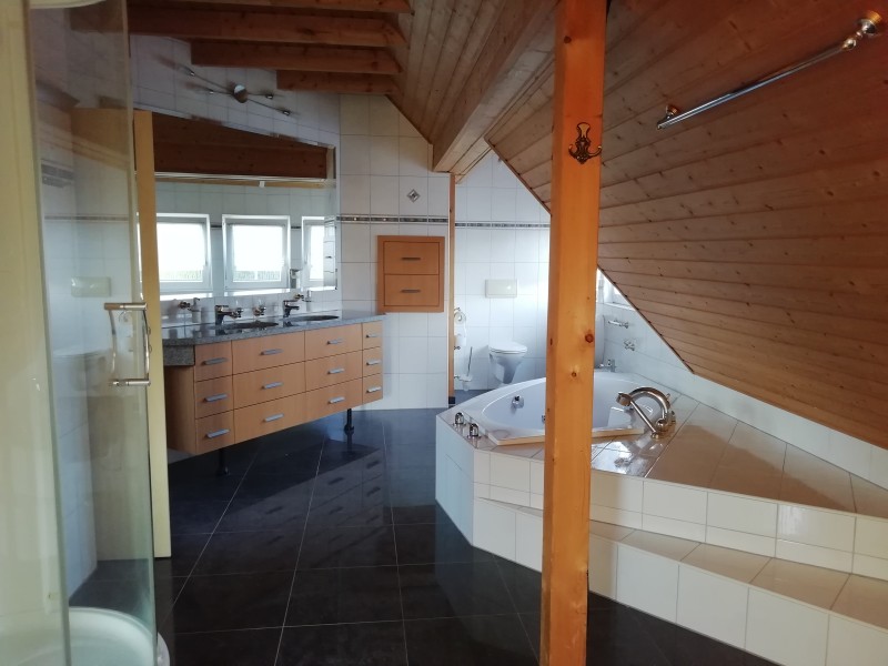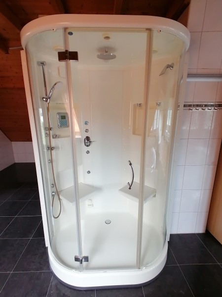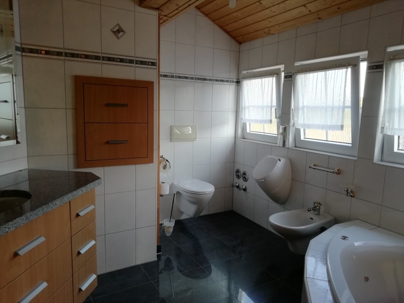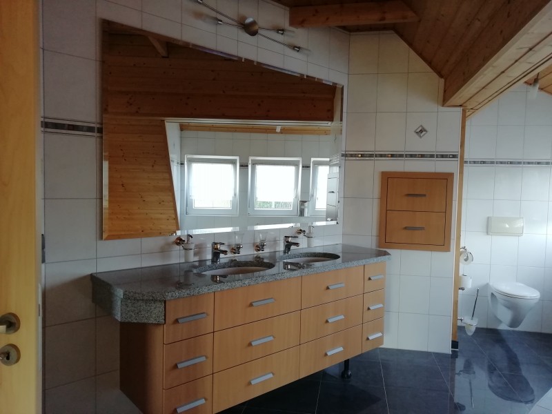 Die Wohnung ist ausgestattet mit einem großzügigen Badezimmer mit Toilette, Urinal, Bidet, 2 Waschtische mit Unterschrank, Schubladen und Granitplatte. Darüber befindet sich ein extra großer Spiegel. Zwei außergewöhnlich große Schubladen sind in der Wand. Eine große Badewanne und eine Luxus Dampf-Aroma- Dusche inklusive zwei Sitzen, LED-Licht und Radio inkl. Im hinteren Bereich gibt es Anschlussmöglichkeiten für Waschmaschine und Trockner.