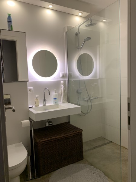 Walk-in wardrobe can only be accessed from the room. Own private bathroom with toilet, rain shower, sink, cabinet, clothes basket. Private entrance to the apartment with intercom.