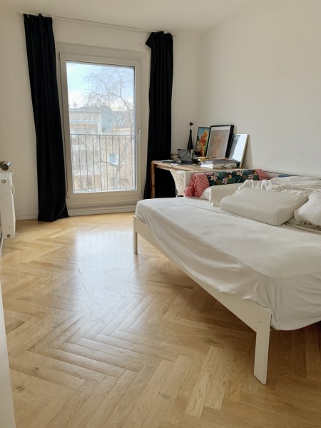 The room has a large window and is sunny east-facing toward the calm and green courtyard. Fully furnished with bed (extendable to double bed), desk, chair.