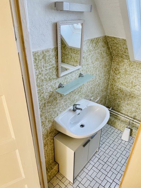 Wenn man durch die Wohnungstür in die Wohnung tritt, befindet sich links das praktische Bad mit Dusche und modernen Sanitärelementen.