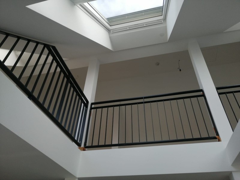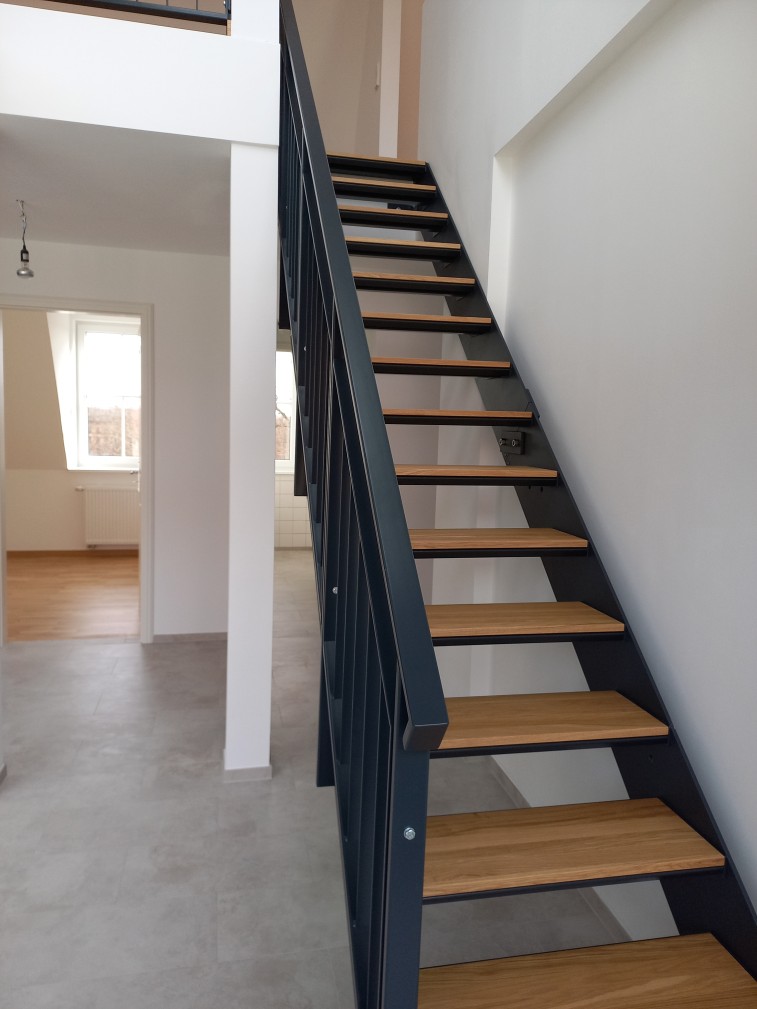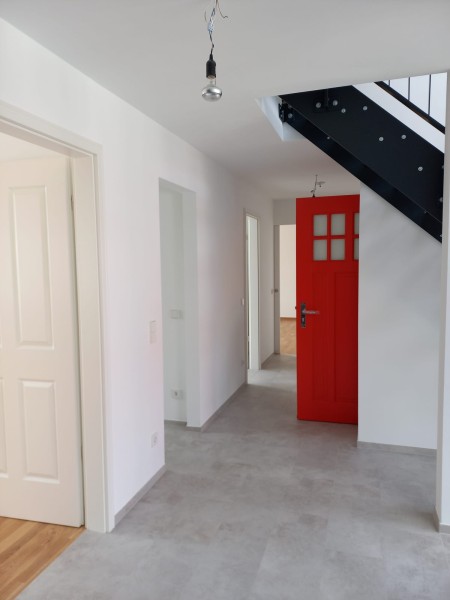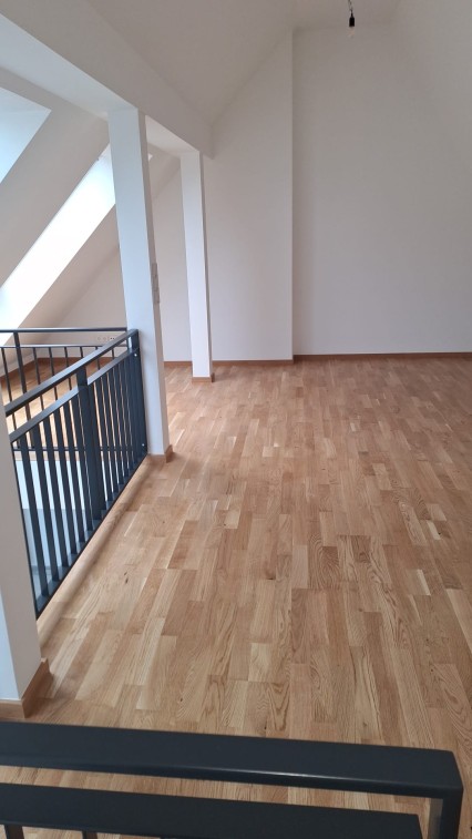 Die Zimmer haben Eichenparkett mit gefliesten, neuen Duschbad, der Eingangsbereich und die Einbauküche sind mit hellen Steinfliesen belegt. Die Treppenstufen zur Galerie sind aus Eiche. Oben auf der Galerie Parkettboden.