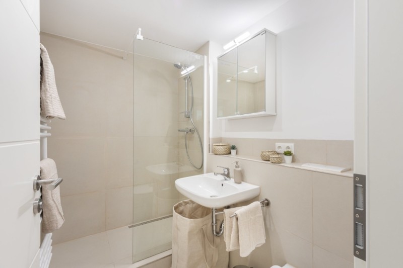 Das Badezimmer ist ausgestattet mit einer großen Dusche.