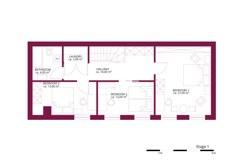 - 3 bedrooms, each one equipped with a double bed or two single beds, a wardrobe and a desk