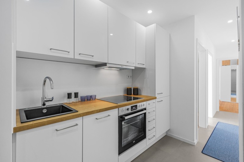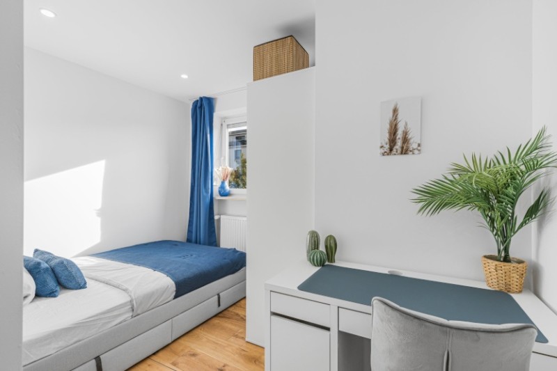 Eine Einbauküche ist Bestandteil der Wohnung und enthält eine Spülmaschine. Die Zimmer sind mit einem Bett, Kleiderschrank, Schreibtisch und Stühlen möbliert. Eine Waschmaschine ist im Bad verbaut.
