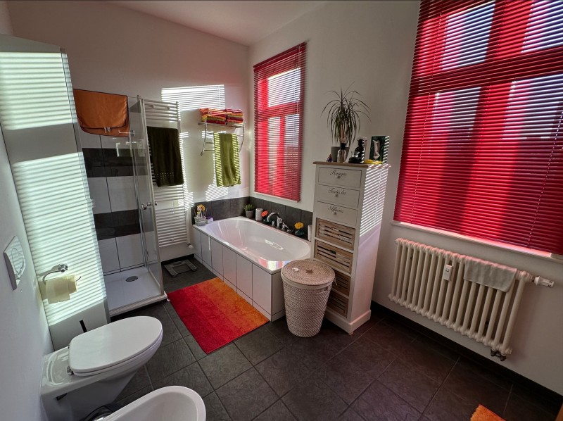 Das Bad mit Bidet, WC, 2 Waschbecken, Badewanne & Dusche weist 2 Fenster auf, der Fliesenspiegel entspricht der Gründerzeit.