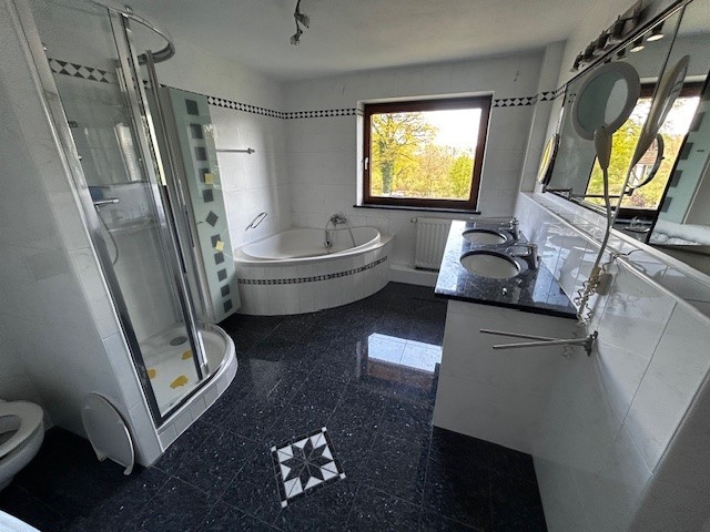 Bei dem zweistöckigen Einfamilienhaus handelt es sich um eine attraktive Immobilie, die durch eine gehobene Innenausstattung in allen Wohnräumen, Fluren, Bädern und Küche besticht. Zu dem Objekt zählen sieben großzügige Zimmer mit großen Fenstern sowie zwei Badezimmer (im 1. Stock und im Erdgeschoss). Besonders attraktiv ist die großzügige Grundstücksgröße von 1500 m² zur Alleinnutzung. Auf dem Grundstück befindet sich noch ein kleines Gartenhaus und zwei Geräteschuppen. Stauraum für Küchenutensilien bietet die bereits vorhandene Massivholz-Einbauküche mit schwarzer Granitarbeitsfläche. Im Keller befindet sich ein Waschkeller, der Heizungsraum sowie ein Vorratskeller mit Regalen und Gefrierschrank.