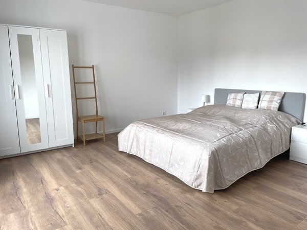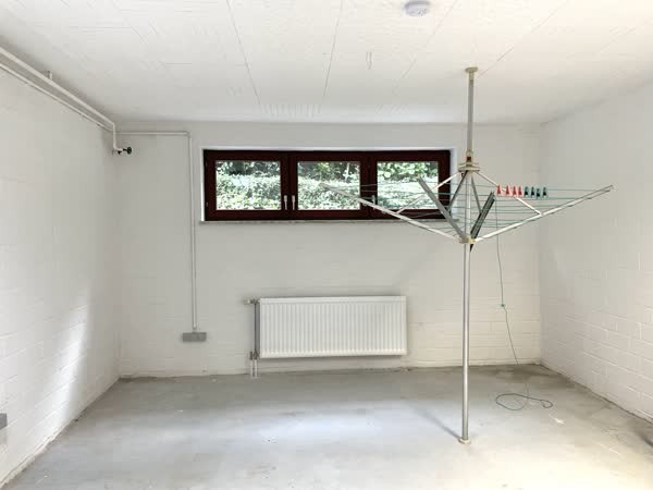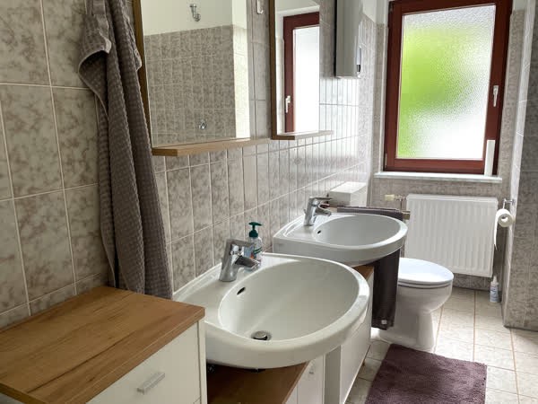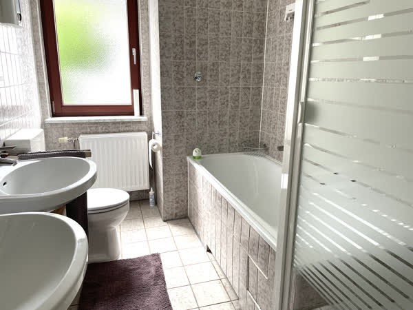 The staircase leads to the three bedrooms, which are all equipped with blinds: the master bedroom with a twin bed, a children's room with a day bed and an additional pull-out bed, as well as a guest room. From the master bedroom you can reach the large balcony facing the garden. The bathroom has both a bathtub and a separate shower and two washbasins. The fully developed attic offers space for two large workstations and a hobby corner with fitness equipment and an art easel. The cosy garden and terrace invite you to linger. Storage space and the possibility to dry laundry is provided by an additional room in the basement.