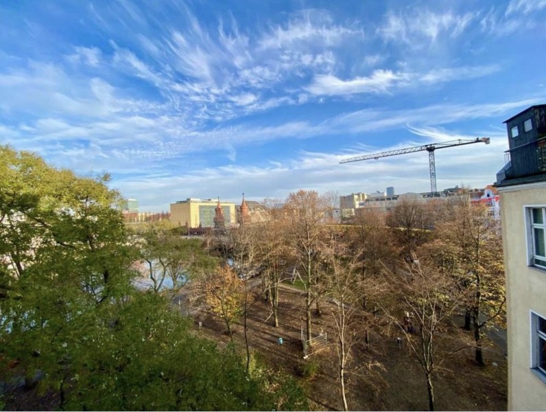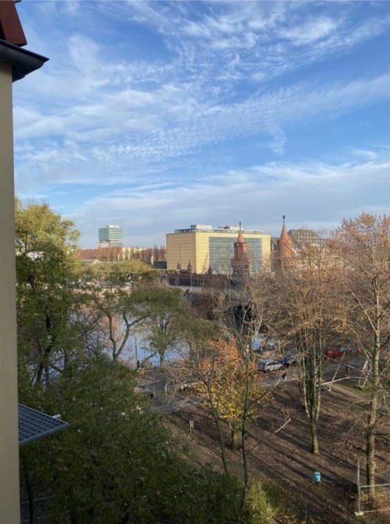 Fußläufig zur Oberbaumbrücke, Warschauer Straße und East Side Gallery. Die Wohnung bietet einen Ausblick ins Grüne, auf die Spree und die historische Oberbaumbrücke sowie die East Side Gallery, sichtbar beim Kochen und aus dem Schlafzimmer. Anbindung an den ÖPNV über die U1 und U3 (Schlesisches Tor) sowie die S-Bahn (S3, S5, S7, S9, Warschauer Straße).