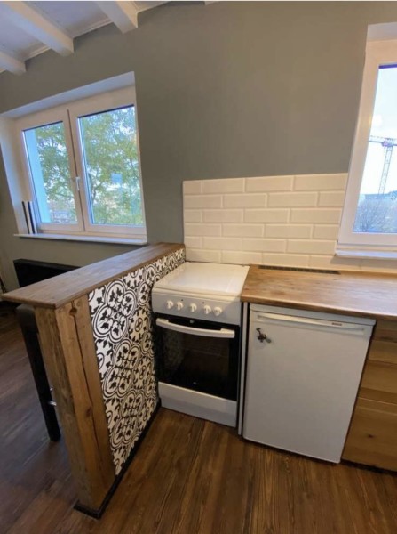 - Ein Wohnzimmer mit offenem Küchenbereich (inklusive Einbauküche und Elektrogeräten)