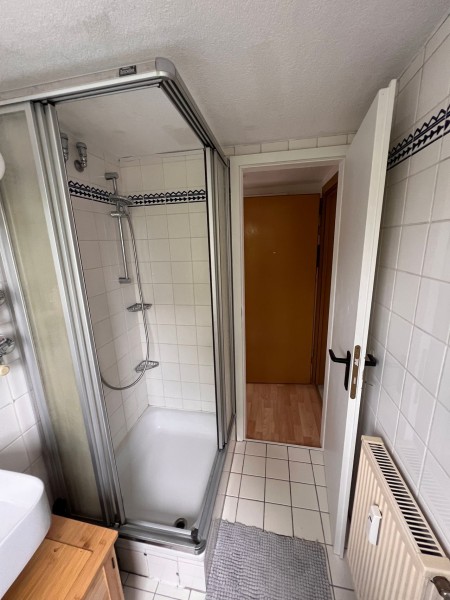 Badezimmer: Ein sauberes und nützliches Badezimmer mit Dusche, Waschbecken und Toilette.