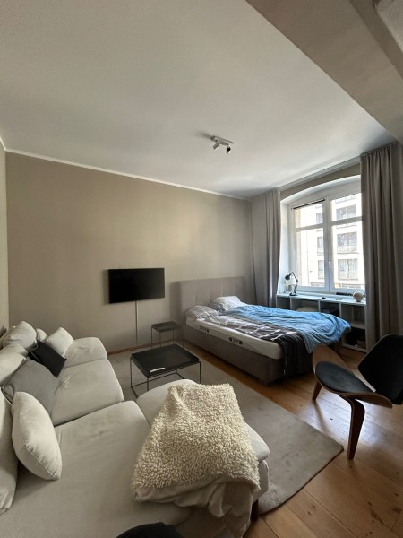 Very beautiful and bright furnished room with large windows (about 22 m²) for rent. Top features in the room include high-quality furniture, a box spring bed, and a cozy sofa corner with its own TV. The room is part of a cozy 2-room apartment, which has a fully equipped kitchen with a microwave, air fryer, washing machine, and dishwasher.