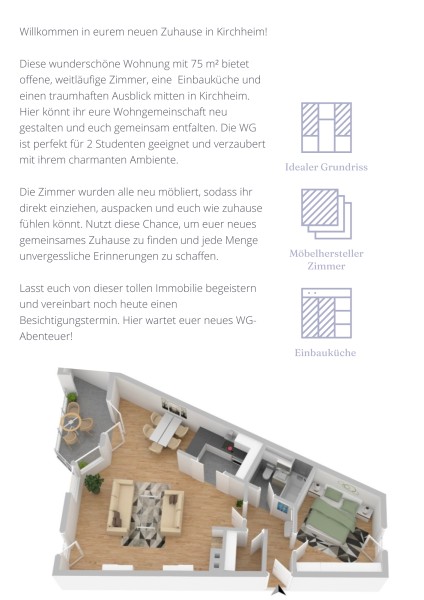 Diese wunderschöne Wohnung mit 75 m² bietet offene, weitläufige Zimmer, eine moderne Einbauküche und einen traumhaften Ausblick mitten in Kirchheim. Hier könnt ihr eure Wohngemeinschaft neu gestalten und euch gemeinsam entfalten. Die WG ist perfekt für 2 Studenten geeignet und verzaubert mit ihrem charmanten Ambiente.