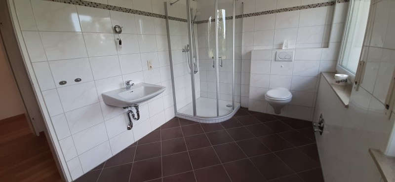 Bad, 8,6 m², helle Wandfliesen, dunkle Bodenfliesen, 2 große Fenster