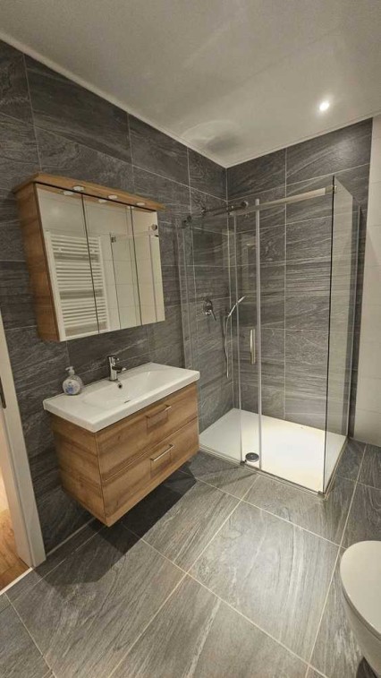 Das Bad hat eine bodentiefe Dusche und ist mit modernen Badzimmermöbeln ausgestattet.