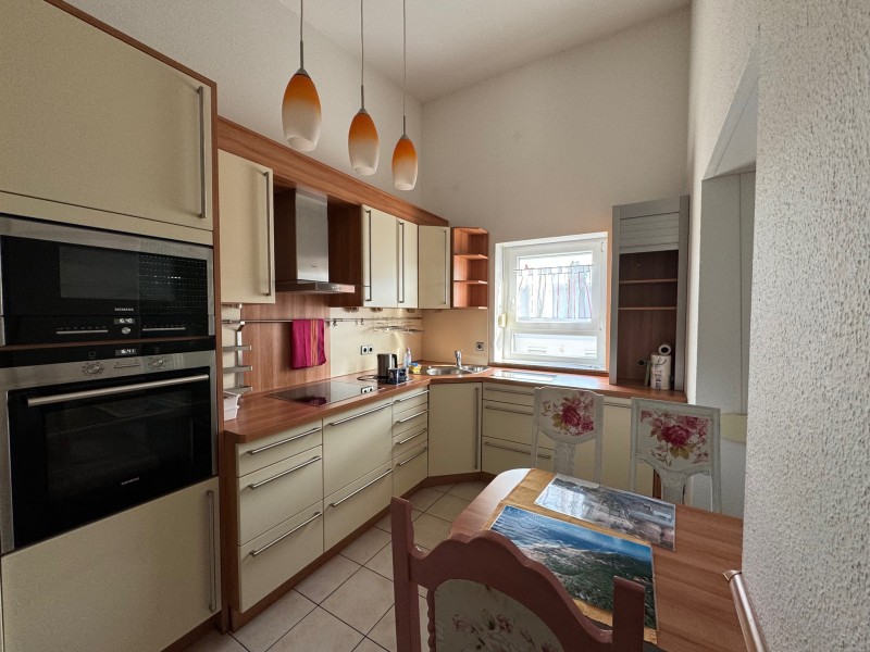 Baujahr 2007. Hochwertige Einbauküche. Der gesamte Wohnbereich ist mit hellem Eichenholzparkett ausgelegt, die Küche und Badezimmer und Gäste-WC sind gefliest.