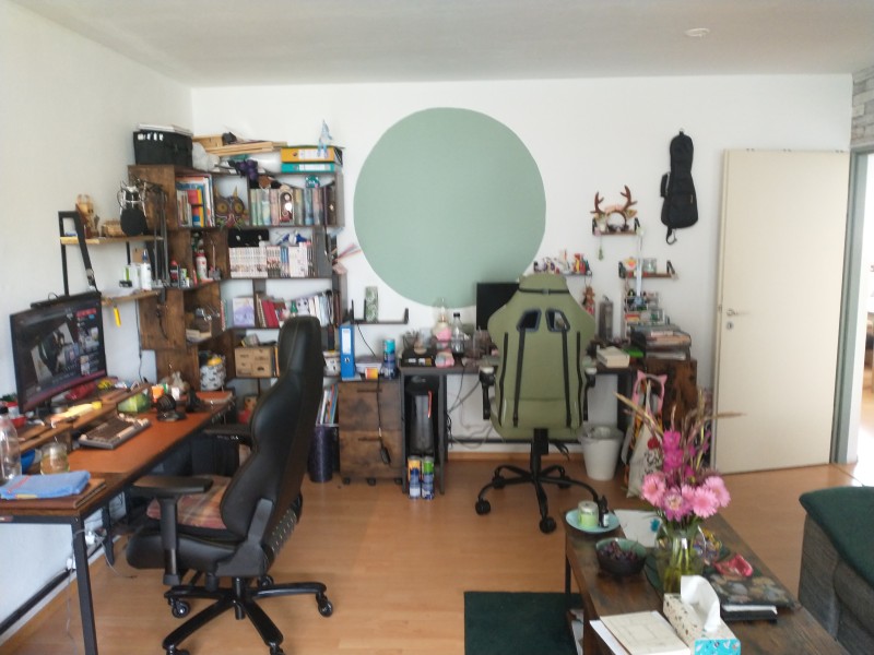 Wenn man durch die Wohnungstür in die Wohnung kommt steht man im langen Flur der mit allen anderen Räumen verbunden ist. Direkt recht hat man das Klo, der nächste Raum am Flur wäre das Bad und danach die Küche (mit Einbauküche) danach mündet der Flur in den halben Raum (Essbereich). Von dort kann man in das Schlafzimmer (rechts) oder ins Wohnzimmer (links). Vom Wohnzimmer hat man Zugang zum Balkon.