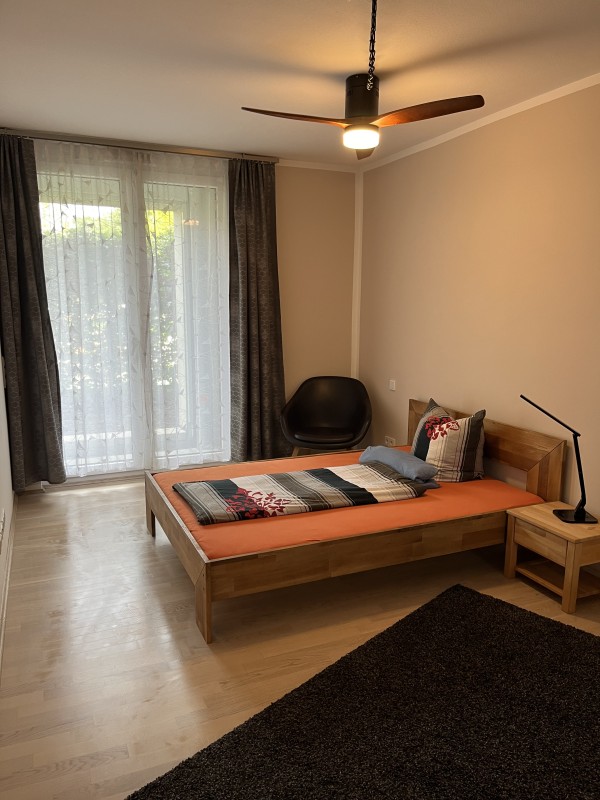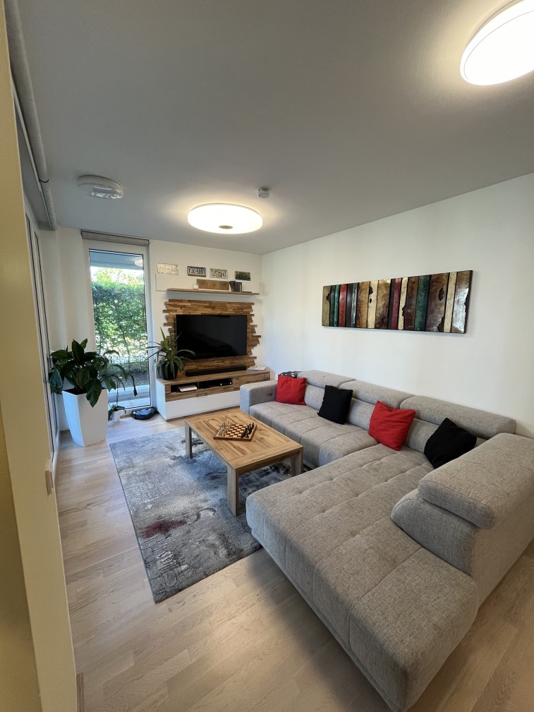 • Großzügiges Wohn-/ Esszimmer mit großen Fenstern und viel Tageslicht (innen- + außenliegende Beschattung), gemütlicher ausziehbarer Couch, Wohnzimmertisch und Low boar und Kommode.