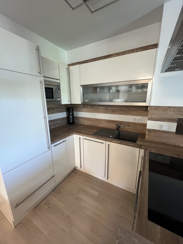 • Moderne Einbauküche mit hochwertigen Elektrogeräten (großes Kochfeld (80 cm), Backrohr, Dunstabzugshaube, Kühlschrank, Spülmaschine und Einbaumikrowelle).