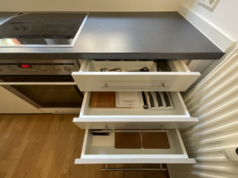 Gemeinschaftsräume sind möbliert, das gemeinsame Wohnzimmer ist mit Sofa, Esstisch und Stühlen ausgestattet. Die Einbauküche mit allen Geräten hat zusätzlich alle Küchenutensielien (Töpfe, Besteck, Geschirr)