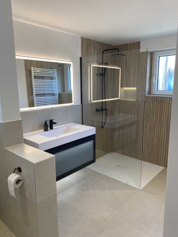 • Neu gestaltetes Bad mit bodengleicher Dusche, großem Spiegel mit LED, schwarzen Armaturen und Handtuchheizkörper