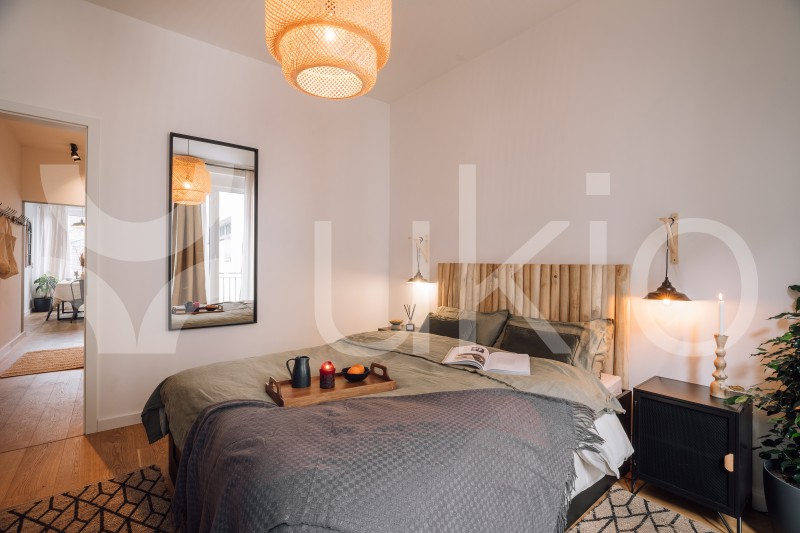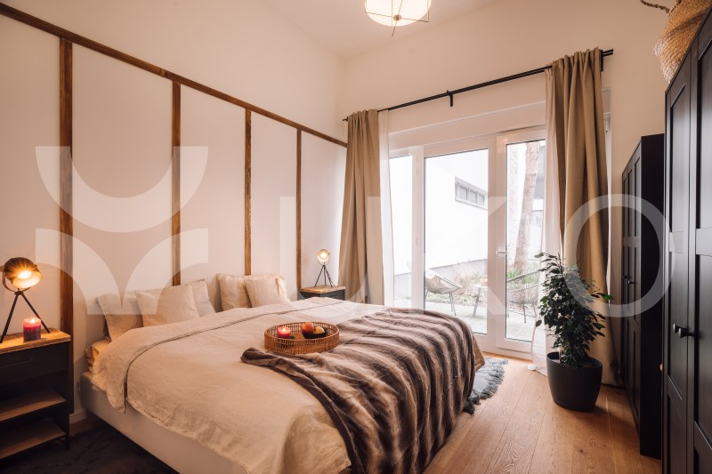 The spacious living room has a dedicated workstation, and the fully equipped kitchen comes with all essentials for home-cooked meals. A rustic dining table adds charm, and the terrace offers a peaceful outdoor retreat. With bike storage available, guests can easily explore the city. Fully furnished, the apartment provides everything you need, including bedding and linens.