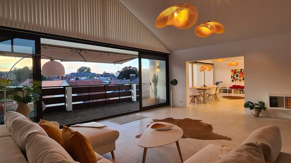 SKY 17, 1A Lage in der Fußgängerzone, voll möbliert, Lift, 2 Bäder (1 x Wanne, 1 x Dusche), sehr hell (raumhohe Glasfläche) und hoch, extrem ruhig und privat, grandiose Aussicht vom ca. 80 qm grossen Balkon/Terrasse, davon 20 qm überdachter Freisitz.