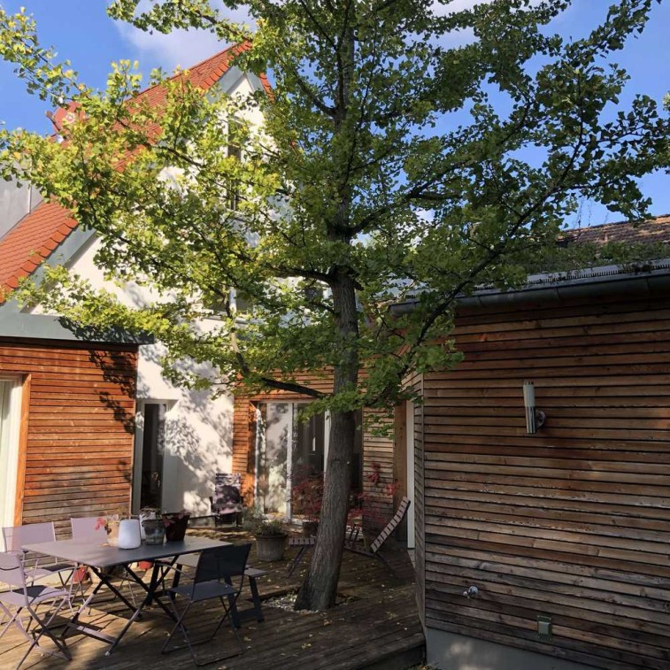 Der Ginkgo mit der umgebenden Holzterrasse ist der Mittelpunkt des Anwesens.