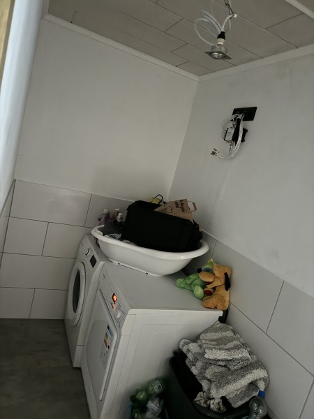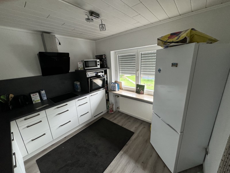 5 Zimmer (3 Schlafzimmer, Wohnzimmer, Esszimmer), Küche (1/2 Jahr alt), Bad (teilrenoviert), Waschraum (für Waschmaschine, Trockner und gr. Kühl- / Gefrierschrank), Balkon (überdacht), 2 - 3 (und mehr) PKW-Stellplätze (kostenlos) und auf Wunsch eine Garage (25,- € extra).