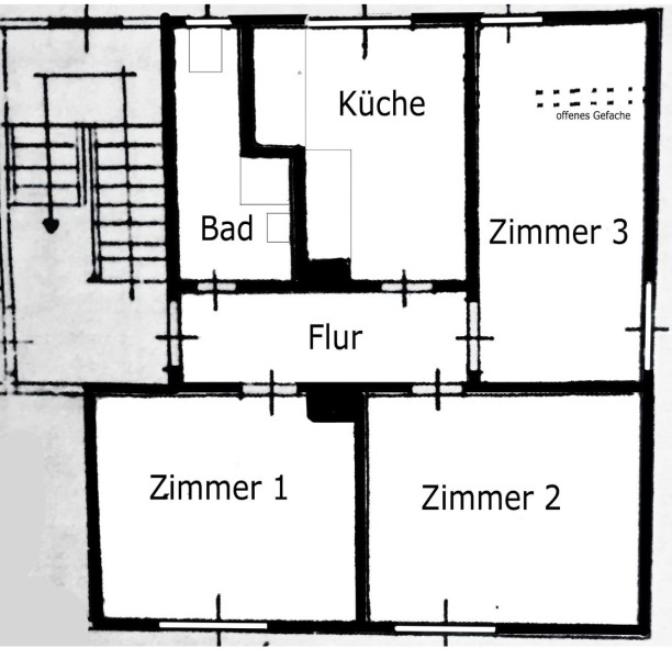 Im beigefügten Grundriss sehen Sie die Aufteilung: zwei annähernd gleichgroße Räume und ein etwas kleineres Zimmer, welches dafür aber über ein charmantes freigelegtes Gefach verfügt.