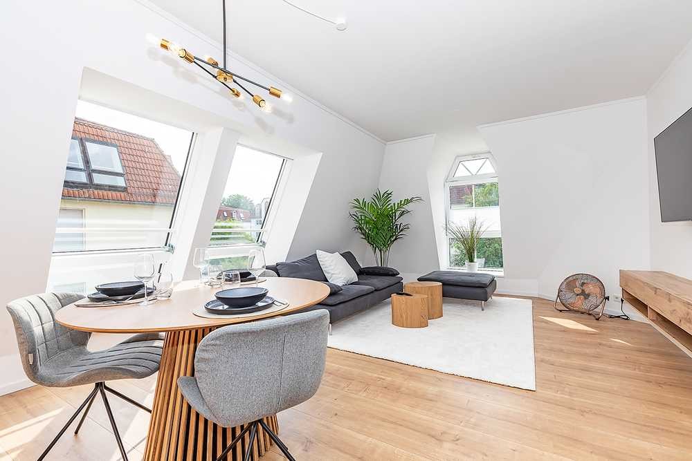 Das Wohnzimmer bietet eine gemütliche Essecke mit einem großen runden Esstisch und bequemen modernen Sesseln, der Platz ist für bis zu 4 Personen ausgelegt. Auf der großen Wohnlandschaft können Sie entspannt den Abend vor dem großen Smart-TV genießen.