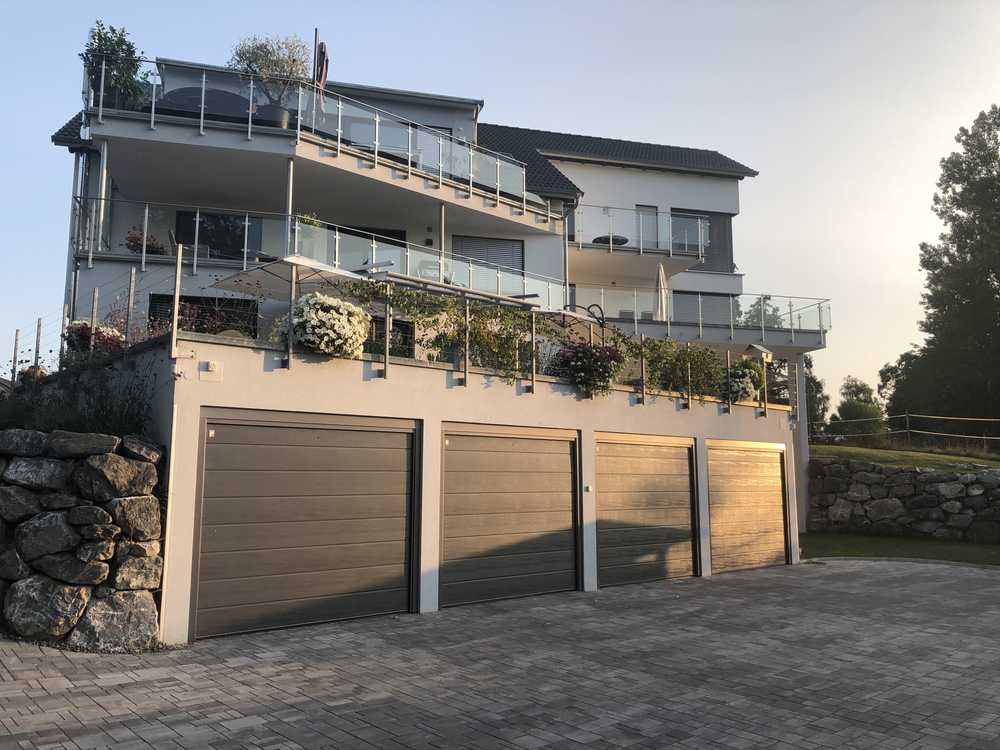 Zur Wohnung gehört ein Garagenstellplatz mit elektrischem Tor und ein Stellplatz im Freien.